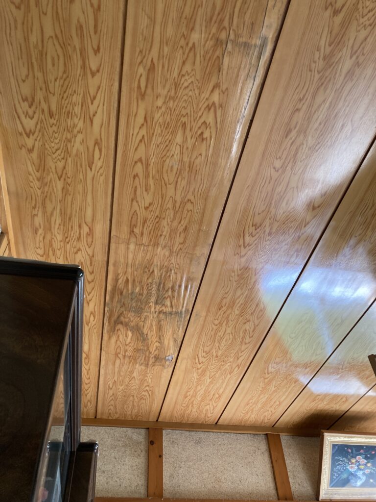 立派な板張りの天井ですが、このように過去の雨漏りの影響からか黒い水漏れ跡が発生しておりました💦