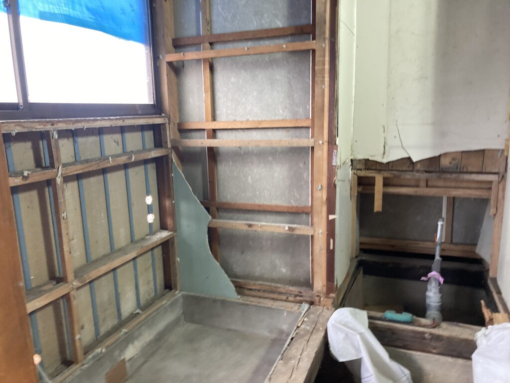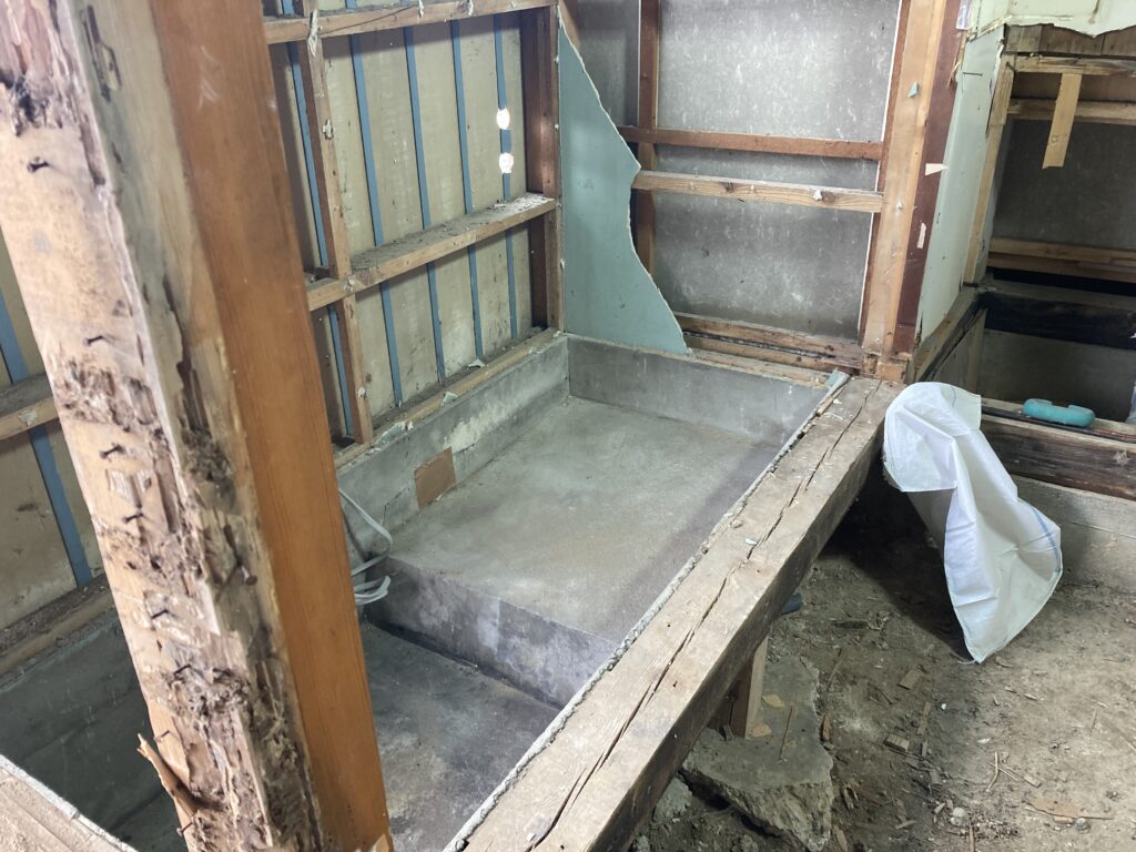 タイル張りの浴室を解体し、配管工事を行った後に土間コンクリート工事を行っております👷