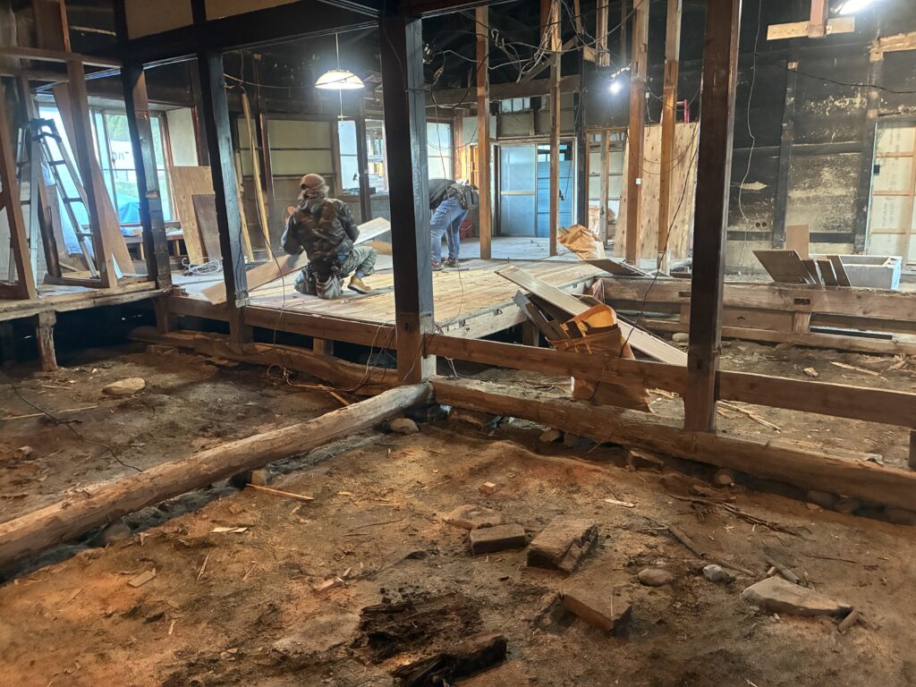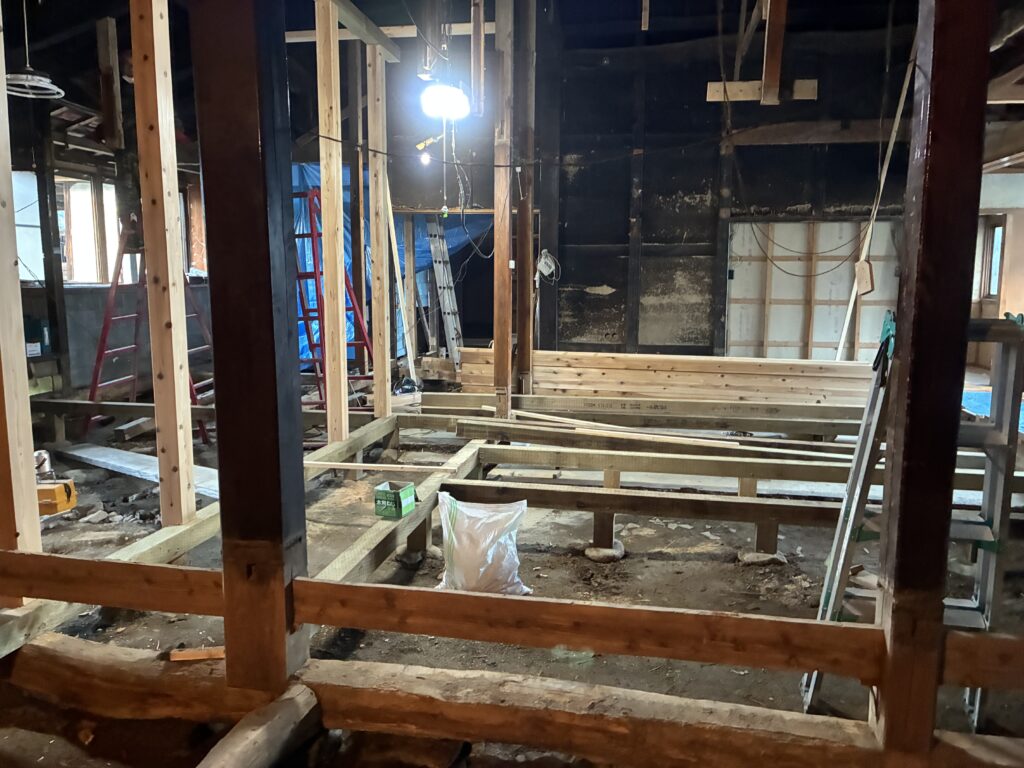 床の解体が終わり、水平・寸法をしっかり決めて各部屋の間仕切りをしていきます!
