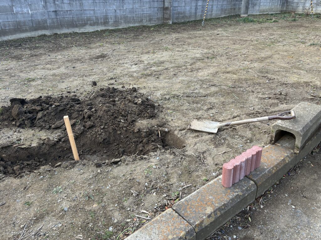 全体の花壇ブロックの配置決めを行い、その形状に合わせて掘削を