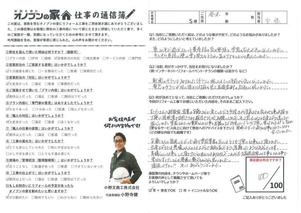オノブンさんへ相談後、営業の安藤さんに来ていただき手続きから完成までの流れや工事の内容を丁寧に説明頂き信用できると確信できたのでお願いしました。そして思った以上の出来上がりと美しさに関心しました。塗装されている業者さんの仕事を近隣の方が拝見していて”とても丁寧に塗ってましたよ!!”と言われ説明いただいた通りの仕事をされているなと安心しました。