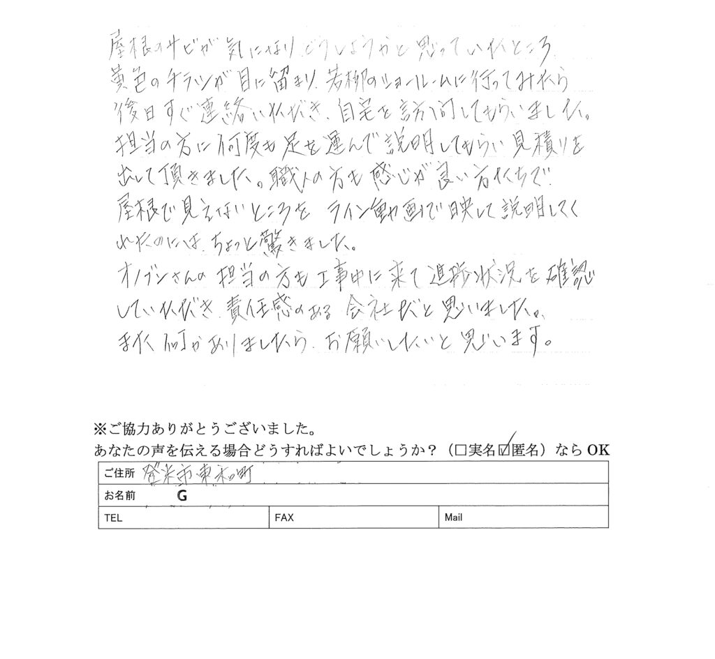 屋根のサビが気になりどうしようかと思っていたところ、黄色のチラシが目に留まり若柳のショールームに行ってみたら、後日すぐ連絡いただき自宅を訪問してもらいました。 担当の方に何度も足を運んで説明してもらい見積りを出して頂きました。職人の方も感じが良い方たちで、屋根で見えないところをライン動画で映して説明してくれたのにはちょっと驚きました。 オノブンさんの担当の方も工事中に来て進捗状況を確認していただき、責任感のある会社だと思いました。 また何かありましたらお願いしたいと思います。