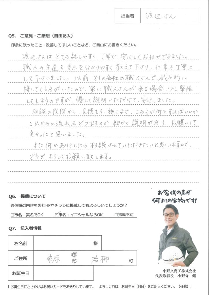 渡辺さんは、とても話しやすく丁寧で、安心してお任せできました。 職人の方達も要点を分かりやすく教えてくださり、仕事も丁寧にして下さいました。以前、別の会社の職人さんで威圧的に接してくださる方がいたので、家に職人さんが来る場合、少し緊張してしまうのですが、やさしく説明いただけて安心しました。 相談の段階から、見積もり・施工まで、こちらが何をすればいいか、これからの流れはどうなるか細かく説明があり、お願いして良かったと思いました。 また何かありましたら相談させていただきたいと思いますので、どうぞよろしくお願い致します。