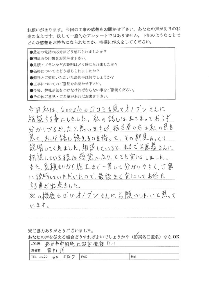 今回私は、Googleの口コミを見てオノブンさんに相談する事にしました。私の話しはまとまっておらず分かりづらかったと思いますが、担当者の方は私の目を見て、私が話し終えるのを待って、その都度ゆっくり説明してくれました。相談していると、まるでお医者さんに相談している様な感覚となり、とても安心しました。また、見積から施工まで一貫して分かりやすく、丁寧に説明していただいたので、最後まで安心してお任せする事が出来ました。次の機会もぜひオノブンさんにお願いしたいと思っています。
