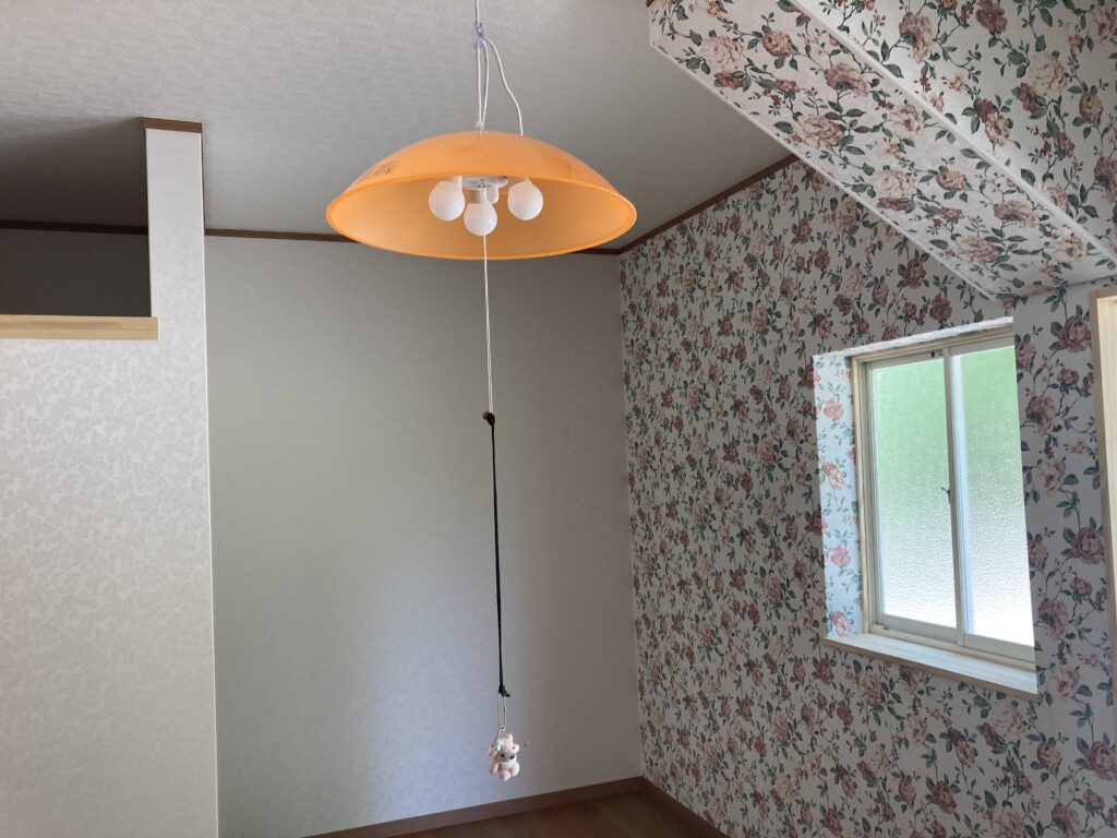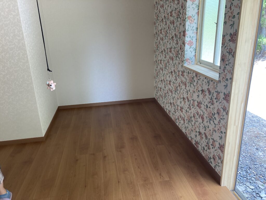 床はフローリング仕上げ、壁は大壁で洋室の作りにして奥様こだわりの花柄のクロスでアクセントをつけ仕上げ、可愛らしいお部屋が完成しました!